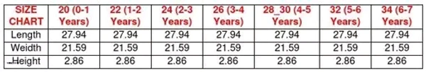 3-4 Years (Top Chest Size: 12.5 in, Top Length Size: 20.5 in, Bottom Waist Size: 16.5 in, Bottom Length Size: 20.5 in)